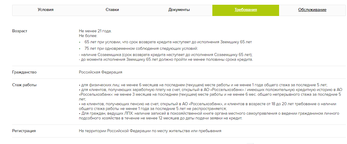 Воспользоваться потребительским кредитованием может заемщик старше 18лет (при наличии обеспечения) и от 23лет без него, имеющий гражданство РФ и стаж работы от полугода. Для зарплатных клиентов минимальный стаж — от 3-ех месяцев, для пенсионеров, получающих пенсию в Россельхозбанке, нет требований по данному вопросу.