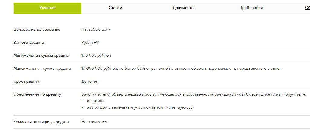 | Требования к объекту | В полном владении у заемщика или созаемщика. Недвижимость предназначается для жилья |