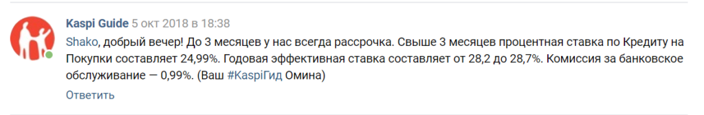 В обсуждениях Вконтакте на официальной странице Каспий представитель написал о процентной ставке в октябре 2018 года. Тогда годовая эффективная процентная ставка составляла 24,99%.