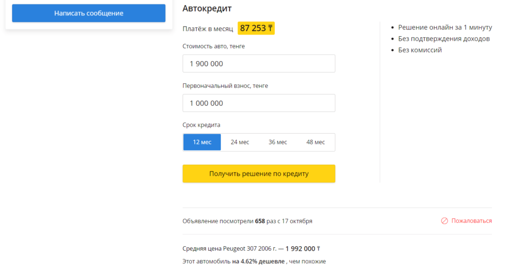 В моем примере машина обойдется мне за 1 млн. 900 тысяч тенге, внесу первоначальный взнос в размере 1 млн. и погашу кредит за 12 месяцев.