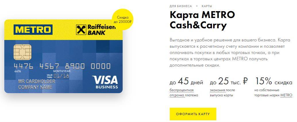 METRO Cash&Carry является эксклюзивным банковским продуктом, предназначенным для удобного расчета в одной из крупнейших торговых точек METRO. Для владельцев карты предусмотрены дополнительные скидки. При покупке собственной продукции марки METRO размер скидки составляет 15%. После выпуска карты клиент может сэкономить до 25 000 рублей. Период беспроцентной отсрочки платежа составляет 45 дней.
