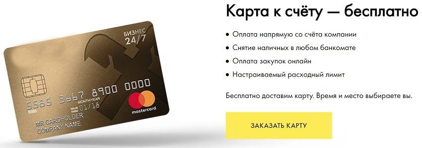 Карта Бизнес 24/7 выпускается в дополнении к расчетному счету. Она обеспечивает доступ к хранящимся на ней счетам в круглосуточном режиме. Деньги зачисляются моментально, а комиссия за вывод через банкомат составляет всего 0,19%.