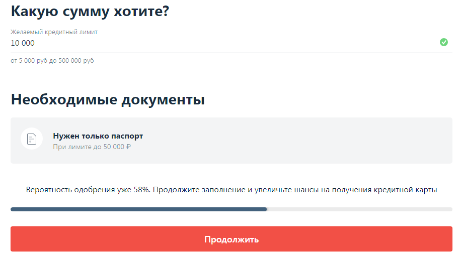 Следующий шаг — выбор суммы кредитного лимита. В зависимости от выбранной суммы программа сразу показывает перечень необходимых документов, которые нужно будет принести на заключение договора в банк. Нажимаем, продолжить.
