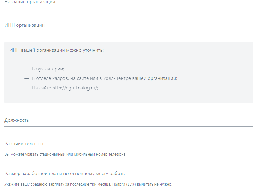 Третий шаг — сведения о работе и организации. Здесь клиенту предлагают заполнить поля с данными о его работе: наименование организации-работодателя, ИНН. Также указываем занимаемую должность, рабочий телефон, размер заработной платы.