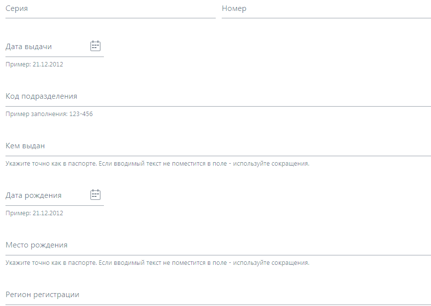 Второй шаг анкеты — паспортные данные. Здесь банк предлагает заемщику заполнить серию и номер паспорта, указать код подразделения, дату выдачи, дату и место рождения.