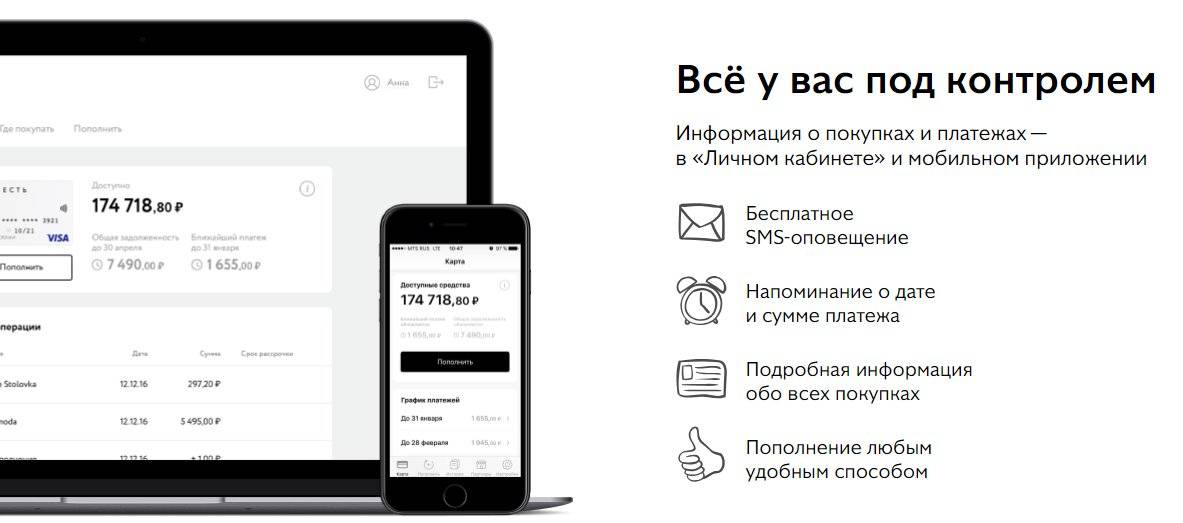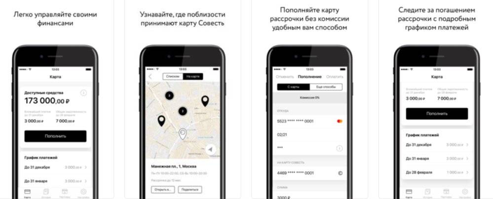 Получив карту рассрочки «Совесть», заемщики могут отслеживать операции в мобильном приложении или в личном кабинете на официальном сайте. Помимо этого в приложении можно устанавливать напоминания о дате и сумме платежа, выбрать магазин, который является партнером банка, и совершить покупку, узнать информацию о пополнении счета и многое другое. Приложение можно установить на устройства Android и iOS.
