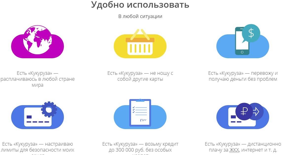 Карта «Кукуруза» является уникальной, т.к. вмещает в себя финтех и разнообразные сервисы. А за счет бонусных программ продукт становится вдвойне полезней. Даже если вы уже имеете какую-то кредитку, «Кукуруза» не помешает. Она будет незаменимым инструментом для выгодного совершения различных финансовых операций, поскольку выполняет привычные функции банковских карт.