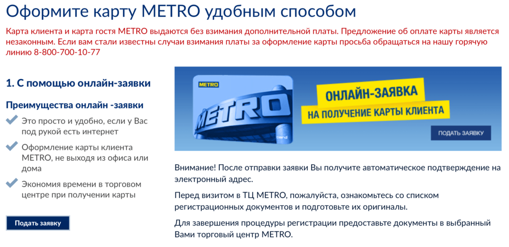 Но чтобы сэкономить время, можно пройти предварительную онлайн-регистрацию – на сайте МЕТРО на странице оформления карты нажать кнопку «Подать заявку».