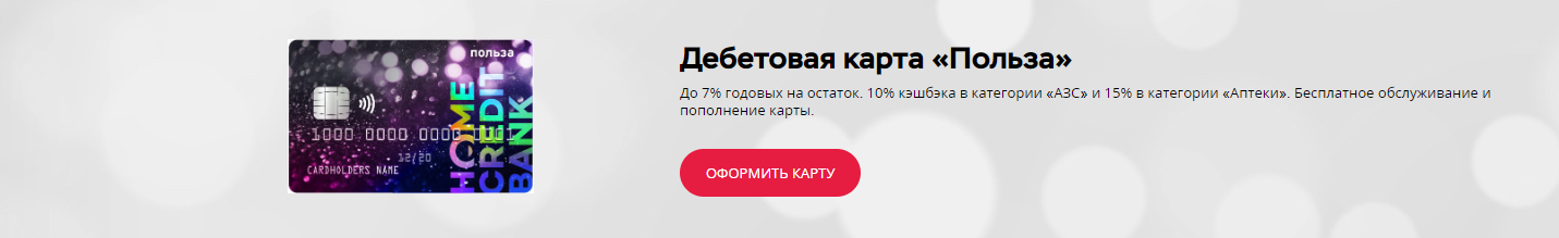 Дебетовые карты позволяют оплачивать покупки и снимать наличные, за счет средств, заранее зачисленных клиентам. Обслуживание их может стоить до 99 р. в месяц. Многие виды дебетовых карточных продуктов в Хоум Кредит обслуживаются бесплатно, а по некоторым из них предусмотрено также начисление процентов на остаток по ставке до 5-10% годовых.