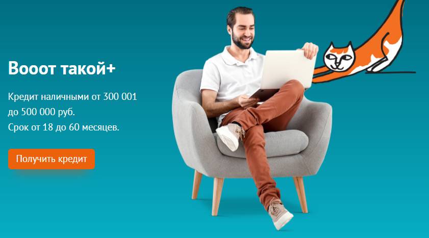 Эта программа предусматривает предоставление кредита на неотложные нужды, но в размере больше, чем предусмотрено программой «Воот такой!», от 300 001 до 500 000 рублей. Кредит можно взять на срок от 18 до 60 месяцев под 18% годовых. Средства кредита банк зачисляет на текущий счет заемщика, которые он может расходовать на любые цели.