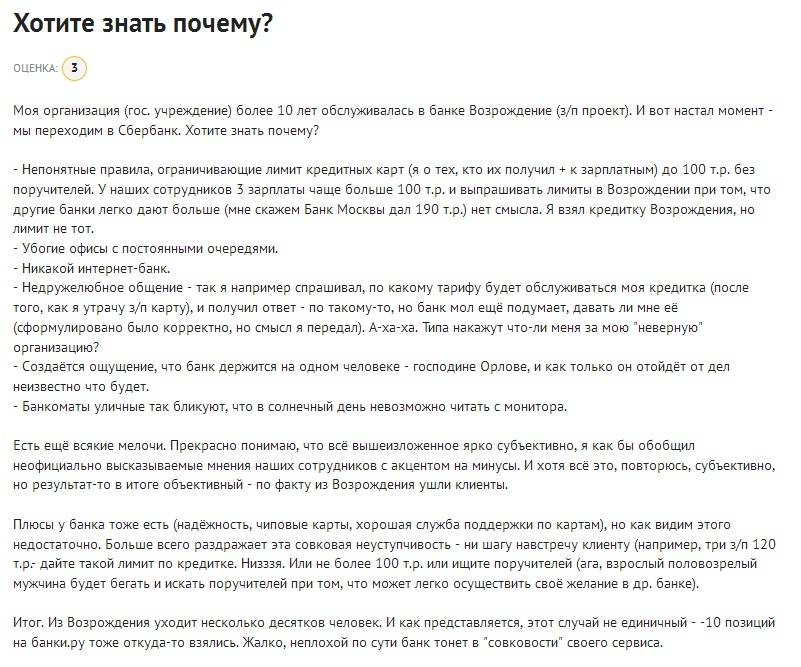 Отзывы по продуктам банка – разные. Есть как счастливые клиенты, так и не очень. Одни довольны сервисом и оперативностью работников банка, другие отмечают медлительность и безразличие. Поэтому если вы планируете оформить кредитную карту Возрождение в онлайн режиме, рекомендуем лично ознакомиться с отзывами реальных людей, чтобы сформировать объективное мнение.