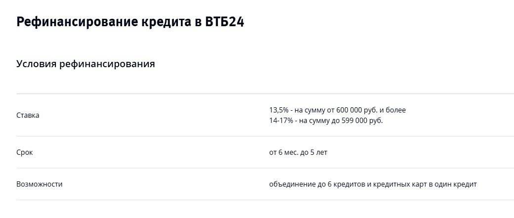 ВТБ 24 своим клиентам предлагает такие условия по рефинансированию:
