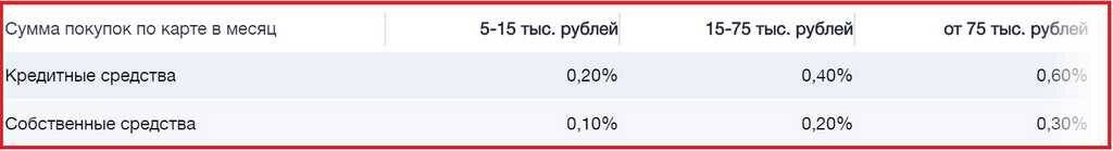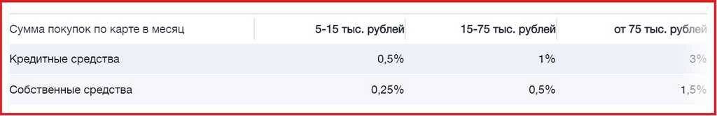 При оплате покупок без платежных систем кэшбэк начисляется в размере 1% от суммы покупок. Предельный размер возврата за месяц — 5 тысяч рублей. Дополнительным бонусом опции Cash back является начисление максимально возможного вознаграждения (2,5%) на все приобретения по карте в первый месяц после подключения услуги.