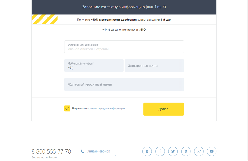 Онлайн-заявка на кредитную карту в Тинькофф банке состоит из 4-х поэтапных шагов. Сначала клиенту нужно указать свои ФИО, мобильный телефон и электронную почту, вписать желаемый кредитный лимит и согласиться с условиями передачи информации.