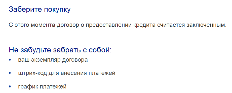 Чтобы забрать покупку, нужно подойти в кассу магазина с товаром, с 2-мя Заявлениями от Почта Банка на кредит на данный товар. Иногда требуется сразу оплатить первоначальный взнос.