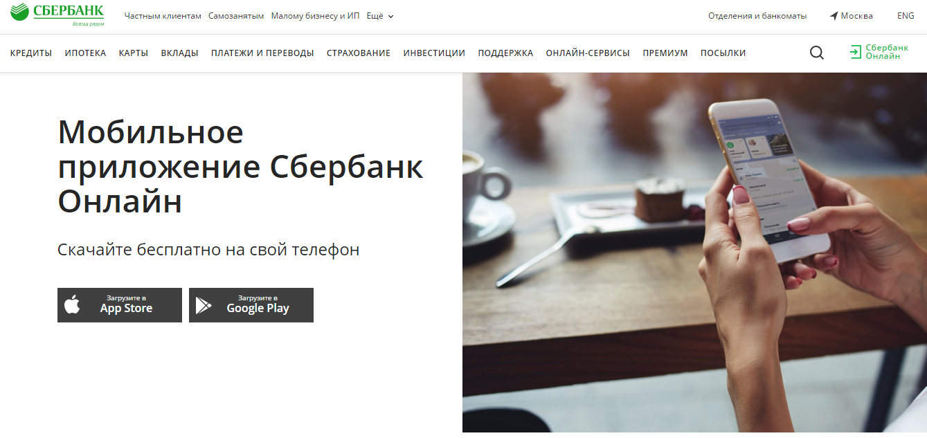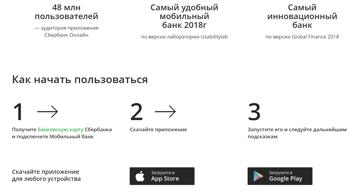 - скачивание и установка приложения на мобильное устройство пользователя. Ссылки на официальные онлайн-магазины App Store и Google Play размещаются практически на каждой странице портала Сбербанка;