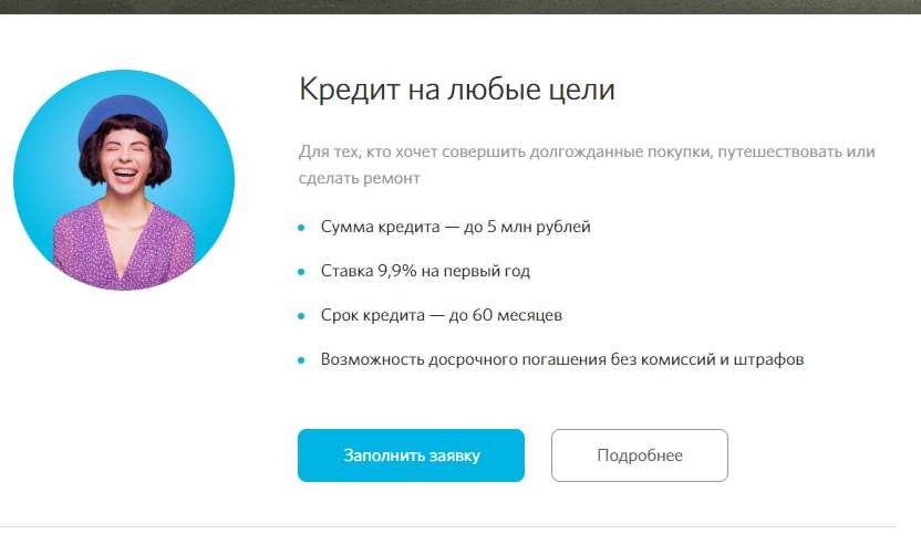 Кредит на любые цели. В случае если заёмщик планирует совершить какую-то долгожданную покупку или же планирует сделать ремонт или отправится в путешествие, данный вариант кредитования считается самым привлекательным. Ставка от 9,9%, но для первого года.