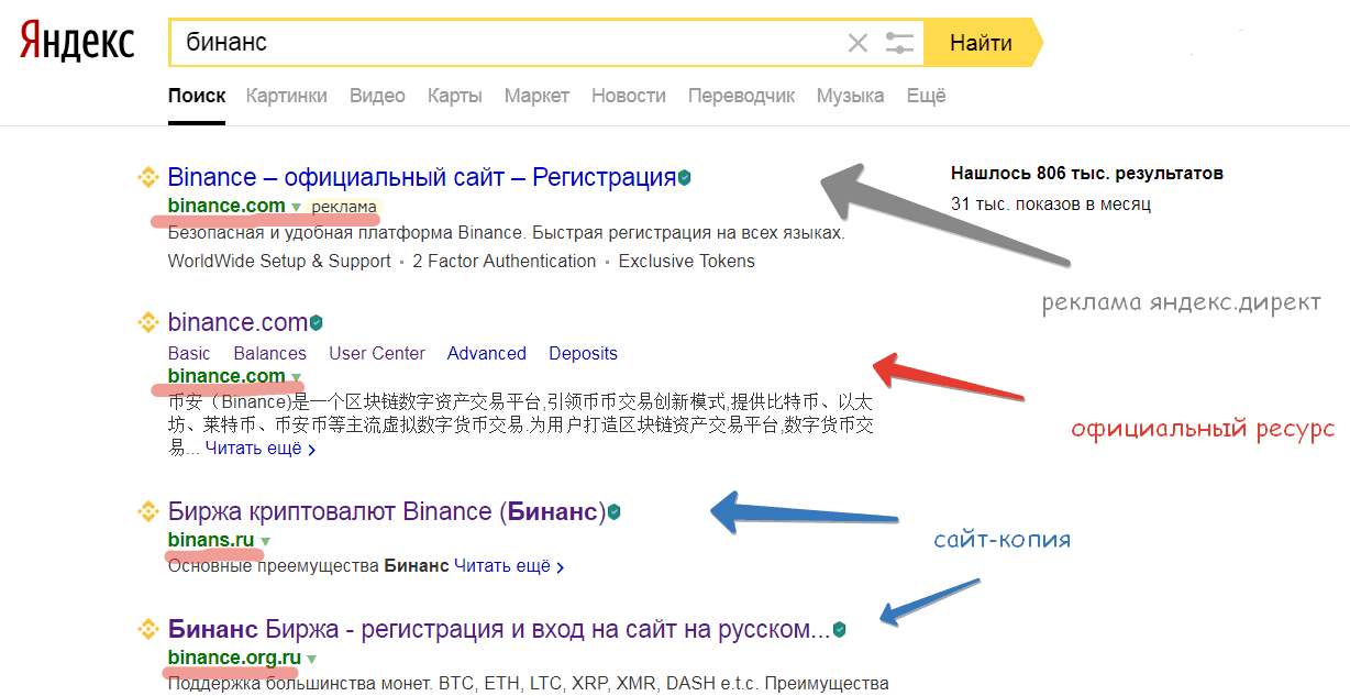 Когда же через некоторое время вы переходите на свою биржу криптовалют из закладок в браузере, то видите только пустые депозиты и переводы транзакций на какие-то сторонние кошельки. Как же это могло произойти? Очень легко! В том поддельном письме была ссылка не на оригинальную биржу, который вы пользуетесь, а на фишинг-сайт мошенников. Фишинг-сайты — это копии тех или иных оригинальных сайтов с измененными доменами.
