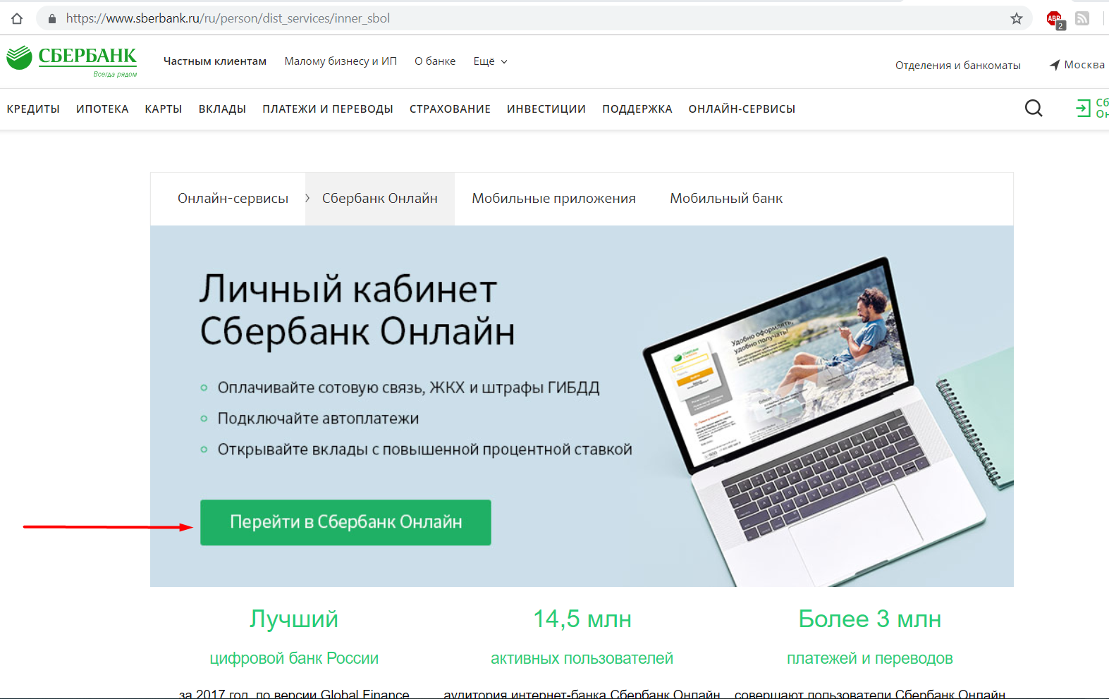 Для входа в личный кабинет на официальном сайте нужно открыть раздел «Онлайн-Сервисы», выбрать «Интернет-банк Сбербанк Онлайн».
