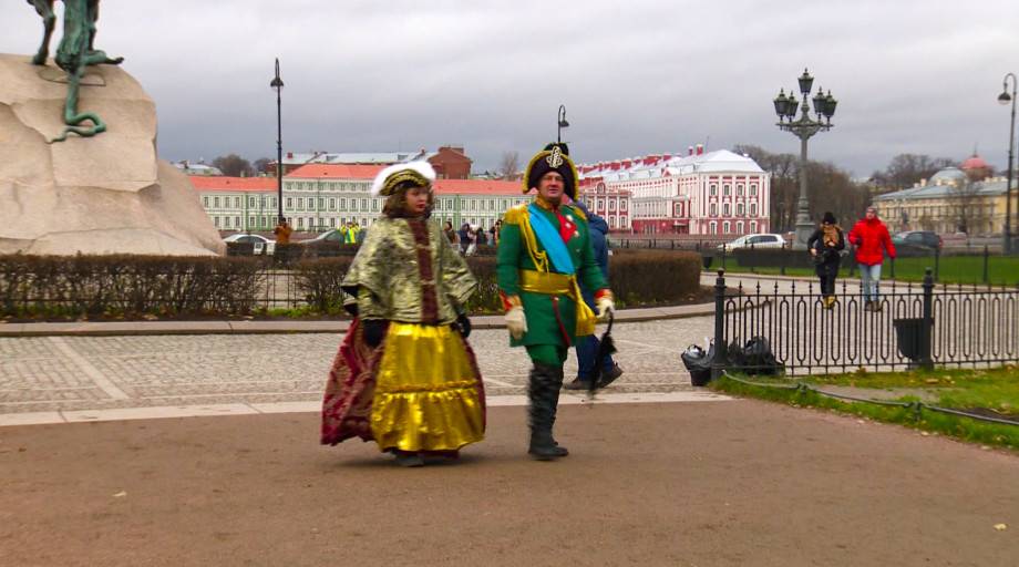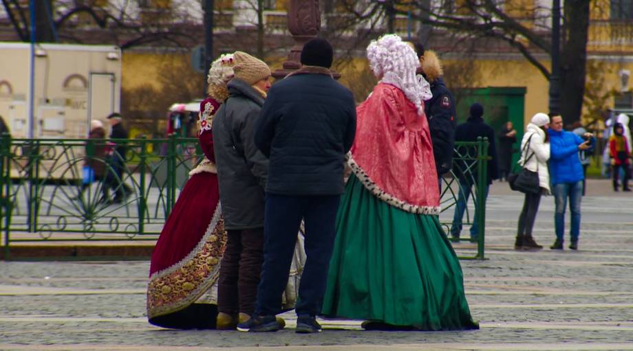 Выходишь на Дворцовую площадь, а навстречу – Петр I и Екатерина II. Лично. Сдержанно и с достоинством, как и полагает монаршим особам, предлагают сделать несколько фотокарточек. Молодая актриса Наталья Мехея однажды тоже решила примерить на себя образ императрицы и выйти на Дворцовую. Тут же ее окружили коллеги-самодержцы. Оказывается, площадь поделена между двумя царскими парами, а чужаков здесь не любят. Монархов сопровождают «пажи» и «фрейлины» в штатском. Занимать «чужую» территорию здесь, мягко говоря, не рекомендуют.