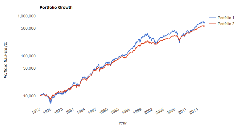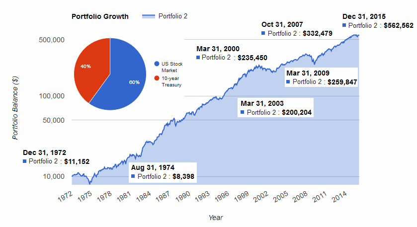 Здесь мы видим, что с начала 1972 по конец 2015 года 10 000$, вложенные в рынок США, с учетом дивидендов превратились почти в 700 000$. Это впечатляет, но вместе с тем на графике мы видим несколько сильных снижений, продолжавшихся длительные промежутки времени. Например, достигнув значения около 360 000$ весной 2000 года, через три года рынок дал только 211 000$, просев более чем на 40%.