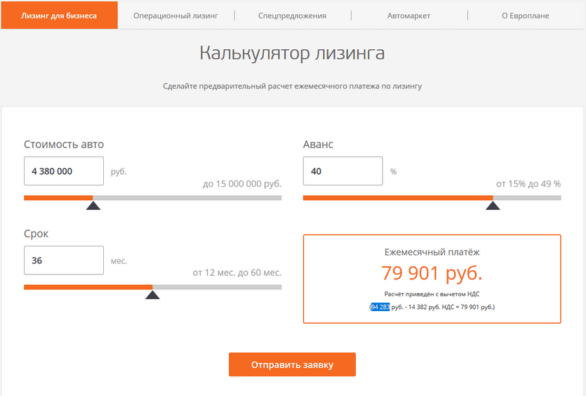 Если сравнивать лизинг с кредитом, платежи оказываются практически одинаковыми. Чтобы заранее узнать размер выплаты, воспользуйтесь калькулятором на сайте лизинговой компании или попросите менеджера предоставить расчет. Для этого нужно знать стоимость машины, размер первого взноса и срок погашения. К примеру, если в Европлан получить лизинговый автомобиль стоимостью 4,4 млн. рублей на срок 3 года с первым взносом 40%, платеж составит около 80 тысяч рублей.