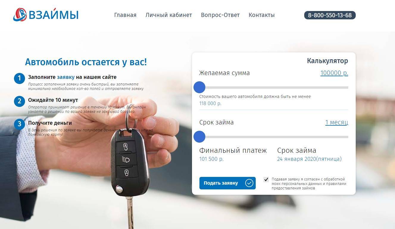 Этот кредит выдаётся под залог персонального транспортного средства (ПТС), проще говоря — под залог автомобиля. В рамках кредитной программы можно занять от ста тысяч до двух миллионов рублей, на срок от одного до тридцати месяцев. Процентная ставка зависит от состояния залога, суммы и срока кредитования. Её величина составляет от 0,2% в день и выше. Состояние кредитной истории клиента в данном случае особого значения не имеет.