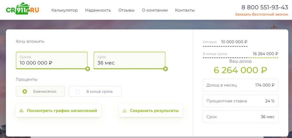 - Вложиться непосредственно в МФК. Порог входа – от 1,5 млн рублей, доходность – от 18% годовых (в зависимости от программы). К примеру, МФК CR911 (Кредит 911) позволяет заработать от 18% до 24% при инвестировании на срок от 12 до 36 месяцев.