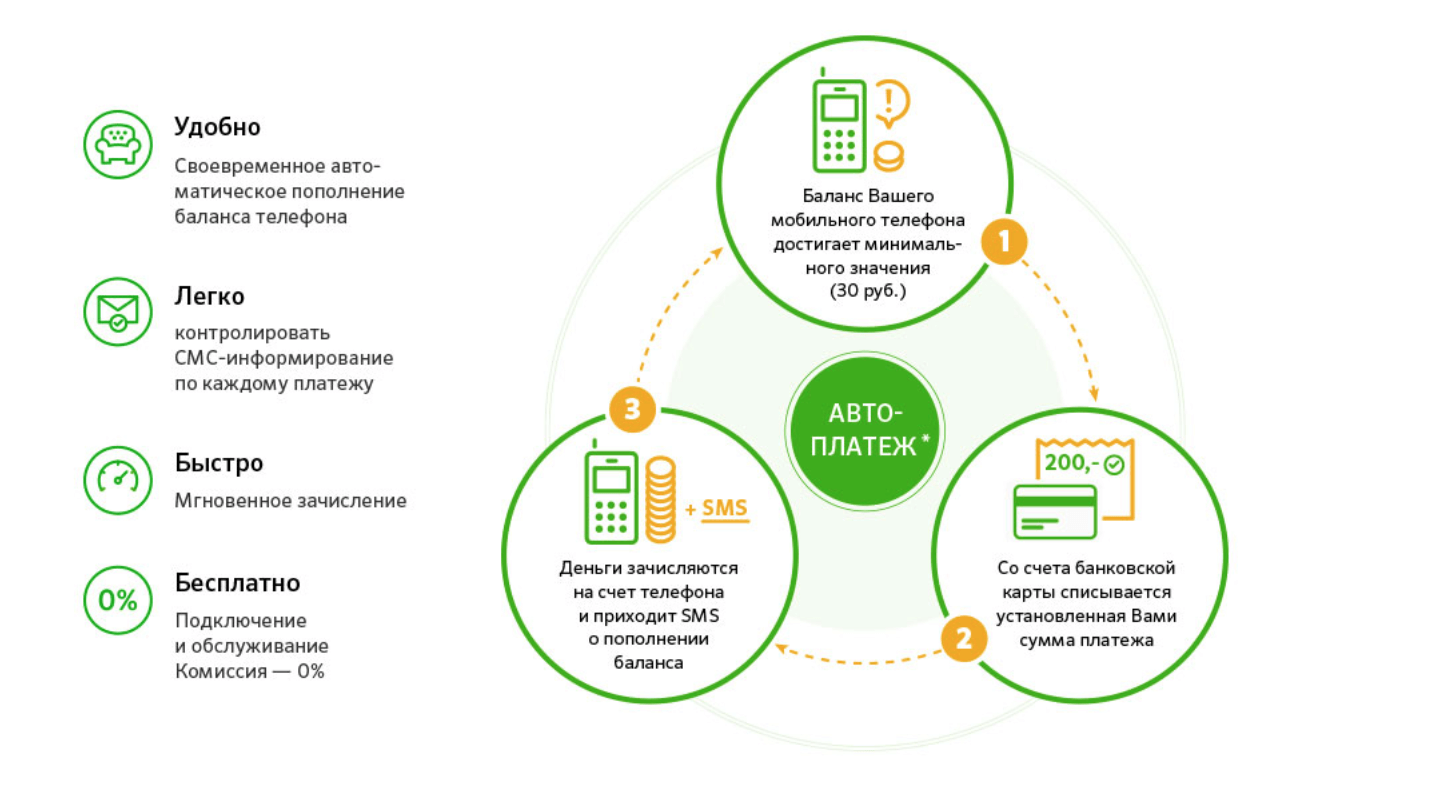 Как часто встречаются ситуации, при которых невозможно совершить звонки по причине недостатка средств на лицевом счете? С Автоплатежом от Сбербанка подобных проблем больше не возникнет. При подключении услуги списание средств происходит автоматически, как только доступная сумма на мобильную связь опускается до уровня минимально установленной. Деньги списываются с банковского счета клиента в пределах установленного им лимита.