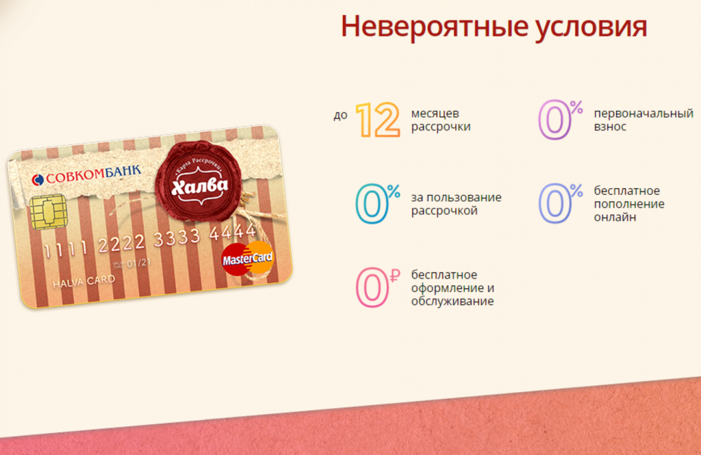 «Халва» оформляется на условиях беспроцентной рассрочки до 12 месяцев при покупке товаров и услуг у партнеров Совкомбанка, при этом не нужно вносить первоначальный платеж. Оформляется и обслуживается, а также пополняется в онлайн-режиме она бесплатно.