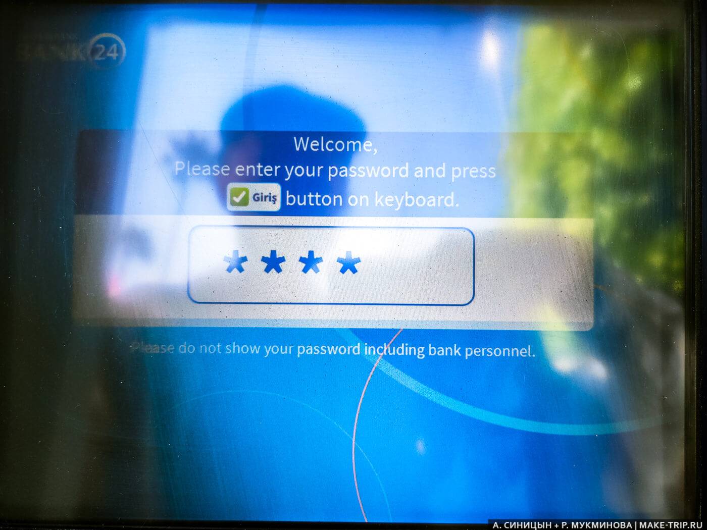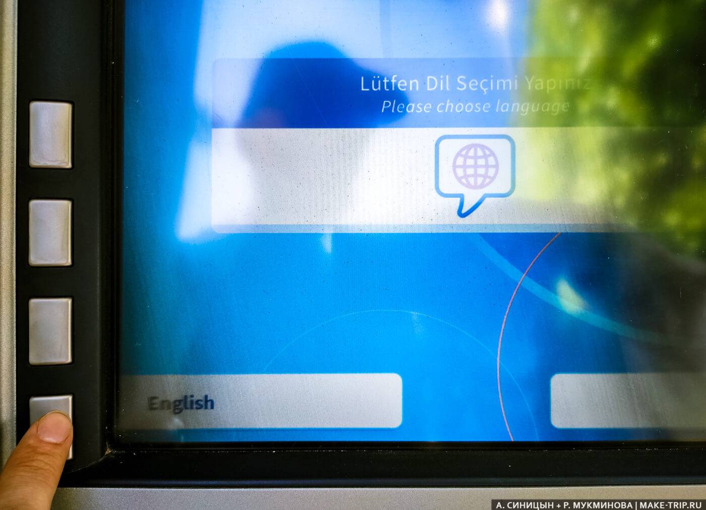 Покажу вам на личном примере, как снять турецкие лиры в банкомате Halkbank. Процесс снятия денег в других банкоматах Турции выглядит почти идентично. Интерфейс этого банкомата, как и почти всех остальных, на английском языке, но там всё интуитивно понятно.