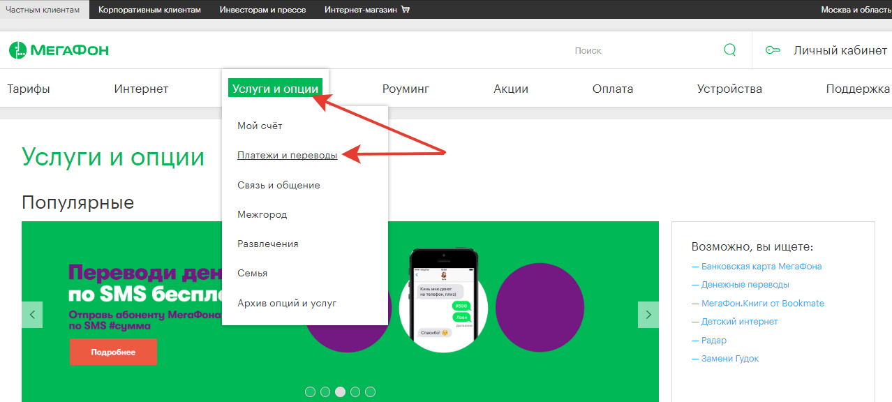 - Открыть главную страницу оф. сайта оператора, навести курсор на “Услуги и опции” и выбрать “Платежи и переводы”. Затем в блоке “Возможно, вы ищете” (справа) кликнуть на строку “Денежные переводы”.