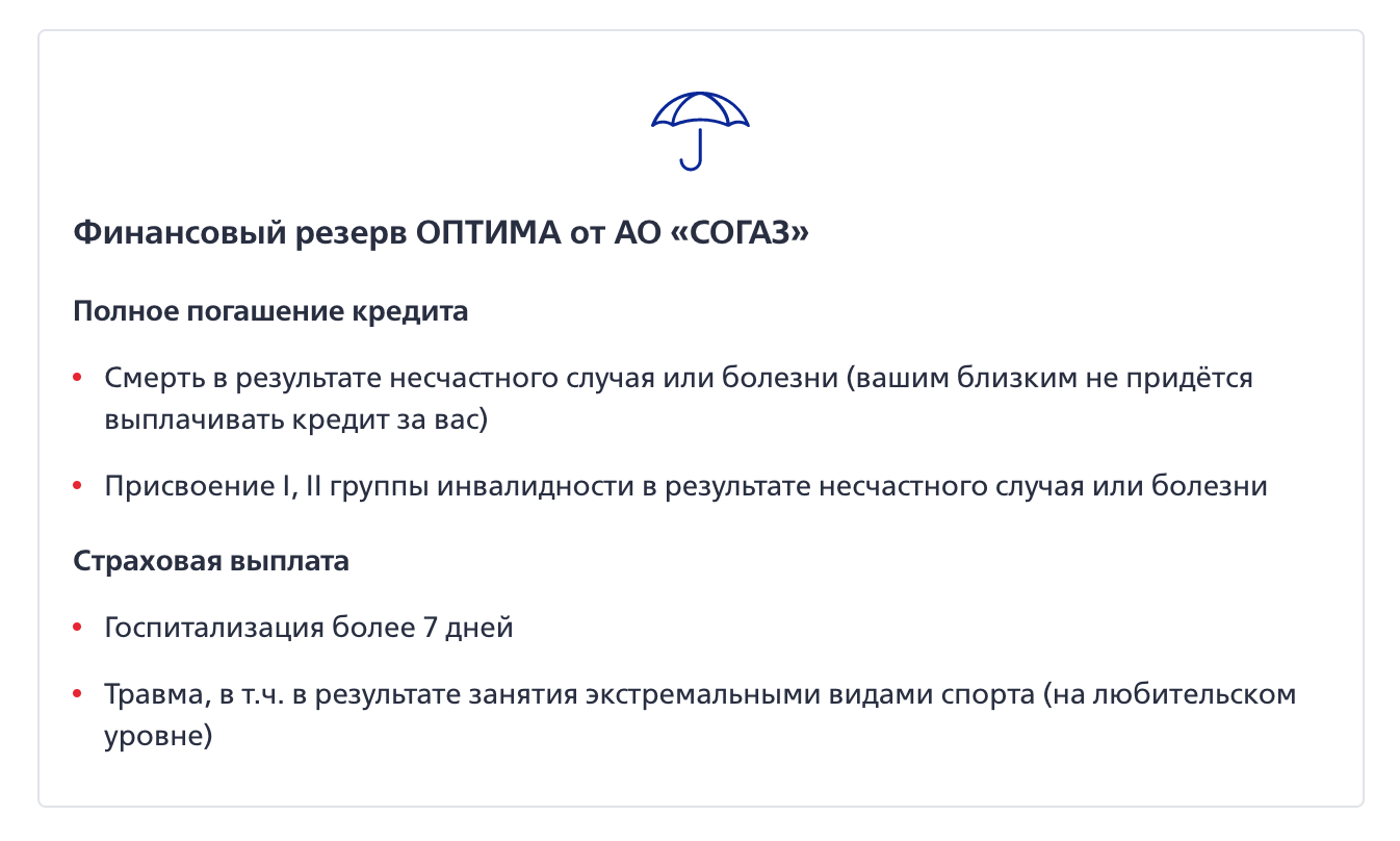 Программа страхования «Финансовый резерв» позволяет погасить задолженность в результате наступления страхового случая. Если заёмщик потеряет трудоспособность (временно или постоянно), получит травму, умрёт, то согласно подписанному договору и при соблюдении всех пунктов соглашения, он или его родные получат определённый процент (до 100%) от суммы страхования, являющийся страховой выплатой. Программа «Финансовый резерв» действует на протяжении всего срока кредитного договора.