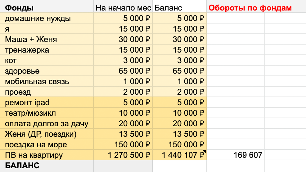 Первым делом я обновляю расходные фонды, они в таблице отмечены светло-желтым. Заполняю только колонку «На начало месяца», колонка «Баланс» будет автоматически считаться по мере расходов.