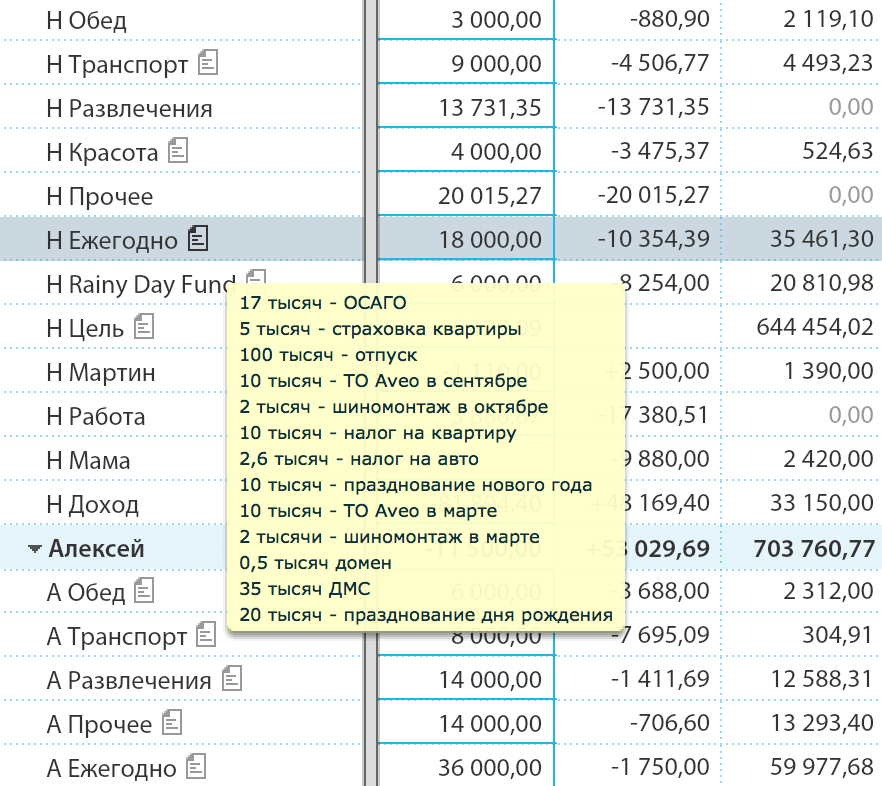 В отпуск мы ездим всегда вдвоем и в итоге вкладываемся в него одинаковой суммой, но все равно считаем его отдельной категорией. Так удобно, потому что можно откладывать когда-то больше, а когда-то меньше. Для сравнения: сумма на продукты в месяц у нас всегда определенная.