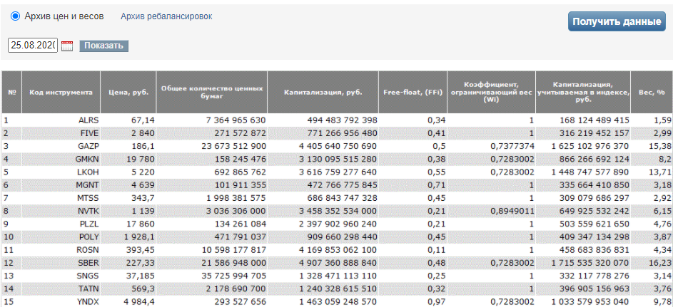 Если отобрать лучшие по «весу» акции индекса, то список будет выглядеть так: