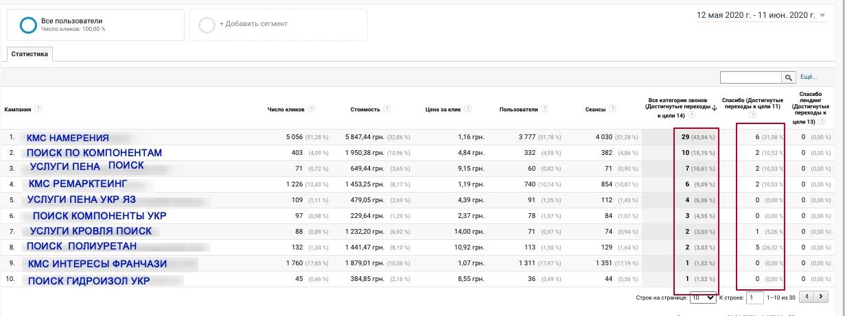 На скрине ниже можно сравнить количество звонков и переходов на страницу «Спасибо за заказ».