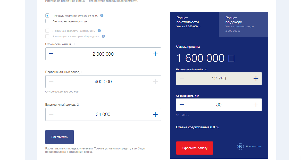 Рисунок 1. Ипотечный калькулятор ВТБ