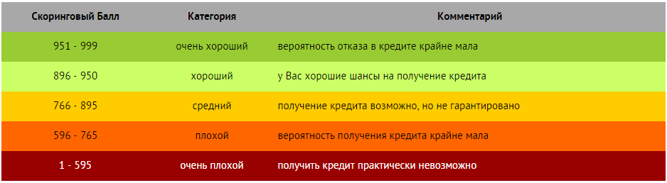 Все БКИ (Бюро Кредитных Историй), которые хранят вашу кредитную историю, обычно оперируют термином «кредитный скоринг». Это шкала от 0 до 1000 единиц. Ваша история взаимоотношений с банками формирует кредитный скоринг, а специальный алгоритм рассчитывает его уровень.
