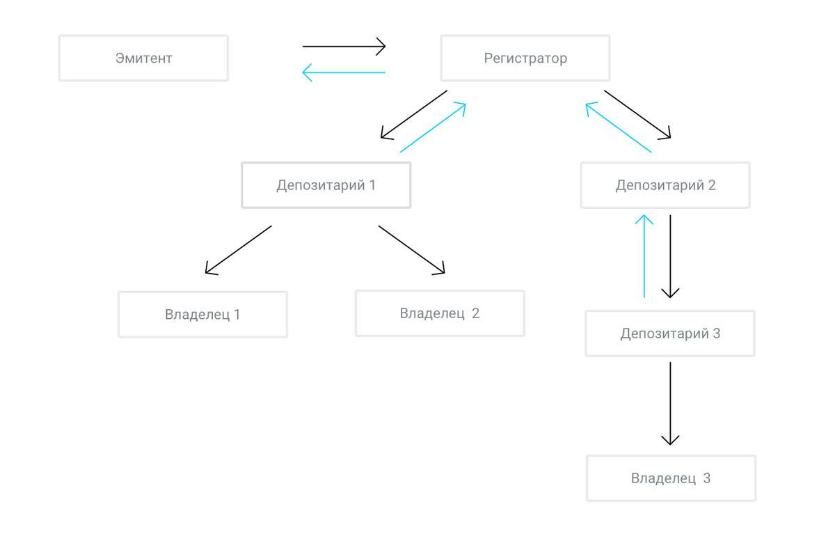 Схема взаимодействия при предоставлении корпоративной информации от эмитента владельцам (черные стрелки) и предоставлении эмитенту информации о владельцах ценных бумаг (голубые стрелки):