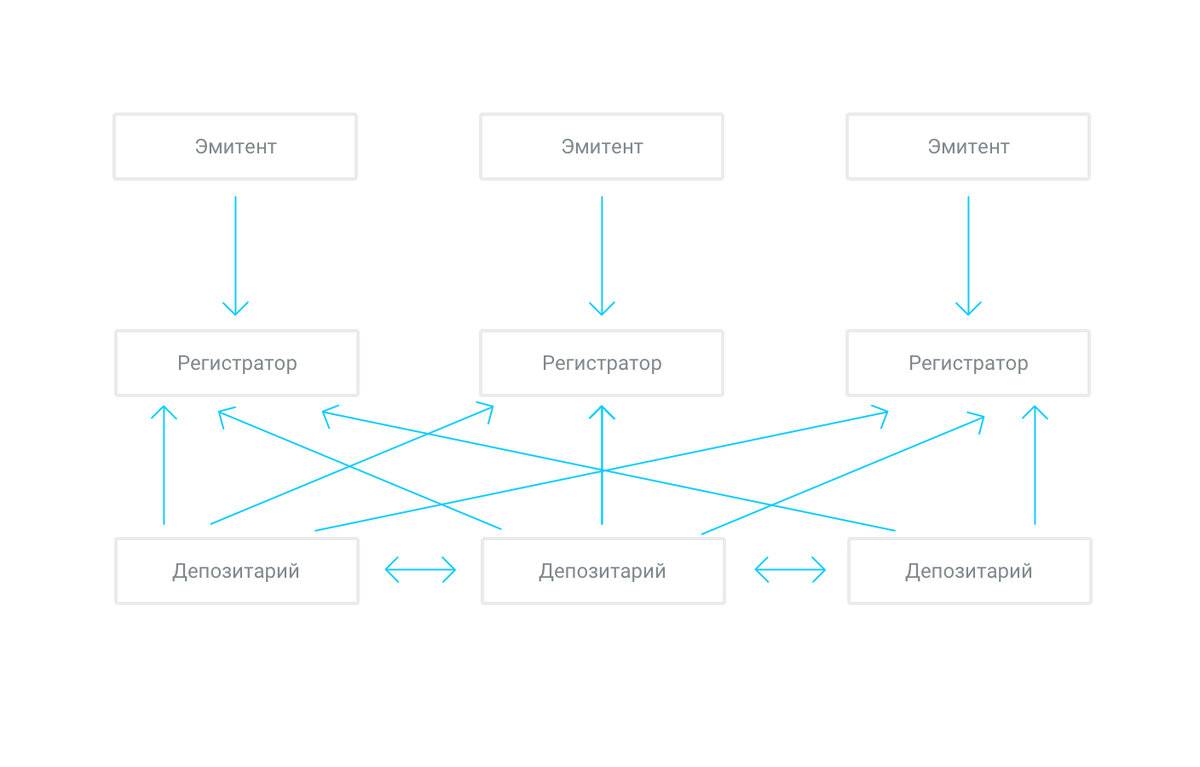 Рис. 2. Схема обслуживания ценных бумаг между депозитариями и реестродержателями без центрального депозитария