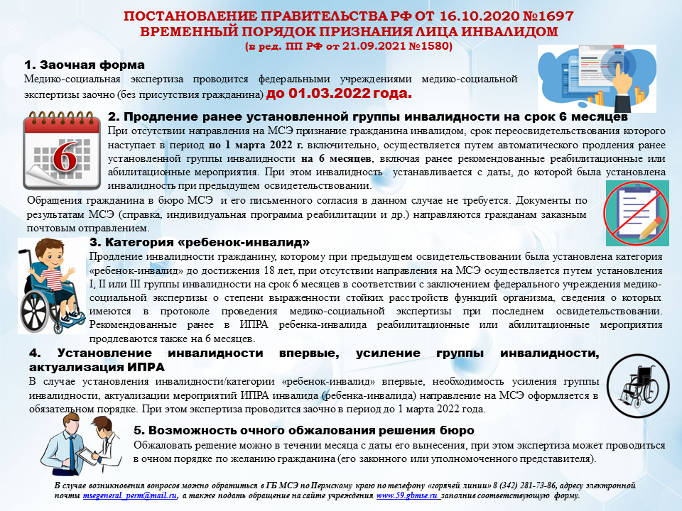 - если срок переосвидетельствования подошел (в период действия временного порядка), инвалидность продлевается автоматически на 6 месяцев;