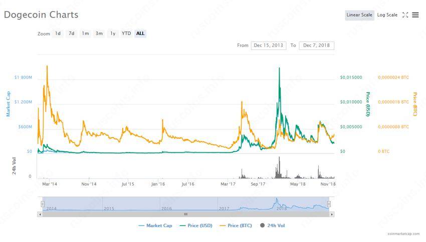 В начале декабря 2018 года монета занимает 20-ю строчку по объемам. Капитализация DOGE составляет $250 миллионов.