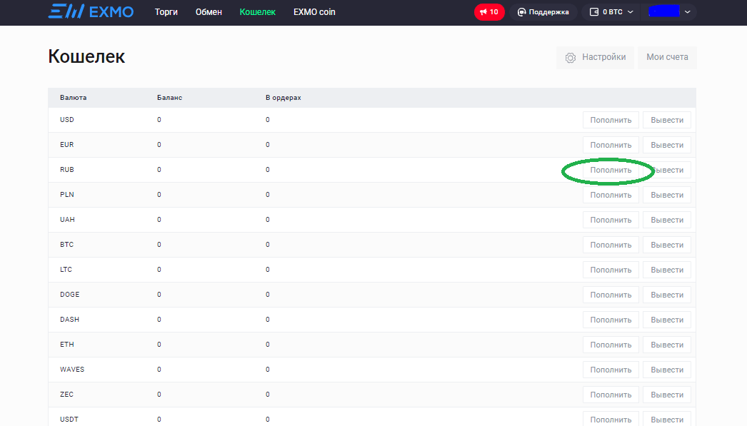 В верхнем меню выберите «Кошелек». Затем, нажмите «Пополнить» напротив рублей.