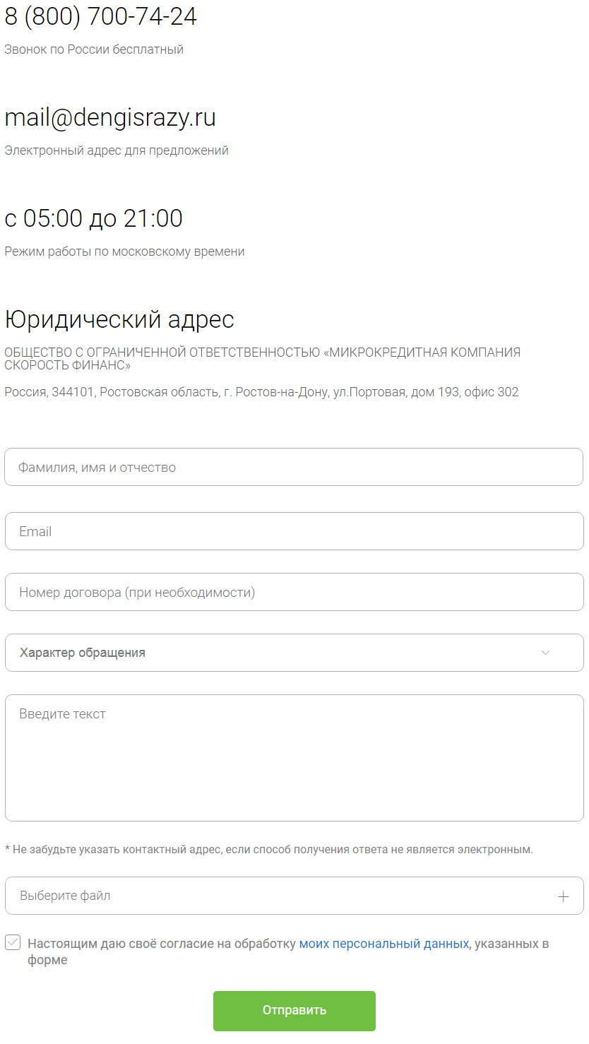- Форма обратной связи в разделе — dengisrazy.online/contacts. Указывают суть обращения и информацию о заемщике — электронная почта для связи, номер кредитного договора, прилагаемые файлы.