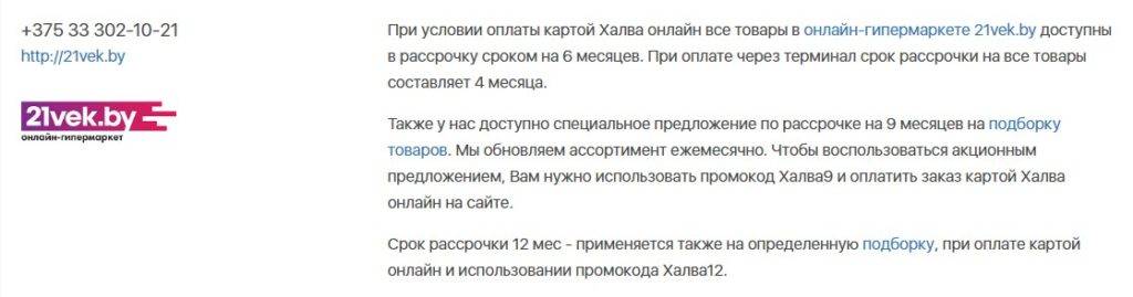 Период рассрочки по Халве в сети партнеров составляет от 1 до 21 месяцев (зависит от условий партнера). Сразу стоит отметить, что рассрочку на 21 месяц предоставляет только один партнер – 21vek, и не на все товары онлайн гипермаркета, а только на выделенный ассортимент.