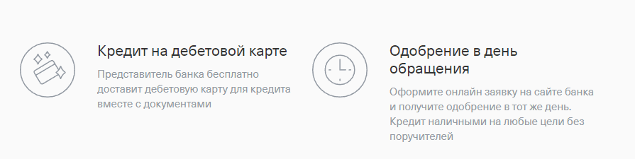 Сумма: 50 000 — 2 000 000 рублей (до 15 000 000 под залог недвижимости); Процентная ставка: от 6,9% до 25,9% (для кредита без залога от 8,9%) Срок: от 12 до 36 месяцев (для кредита под залог квартиры — до 15 лет) Скорость рассмотрения заявки: до 10 минут Штраф за просрочку регулярного платежа: 0,1% от просроченной задолженности Подтверждение дохода: не требуется Прописка в регионе присутствия банка: не требуется Возраст: от 18 лет