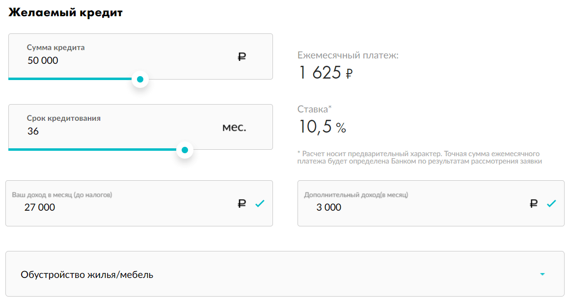 - Укажите параметры ссуды (срок, сумма). В поле справа появится размер ежемесячного платежа и процентная ставка.