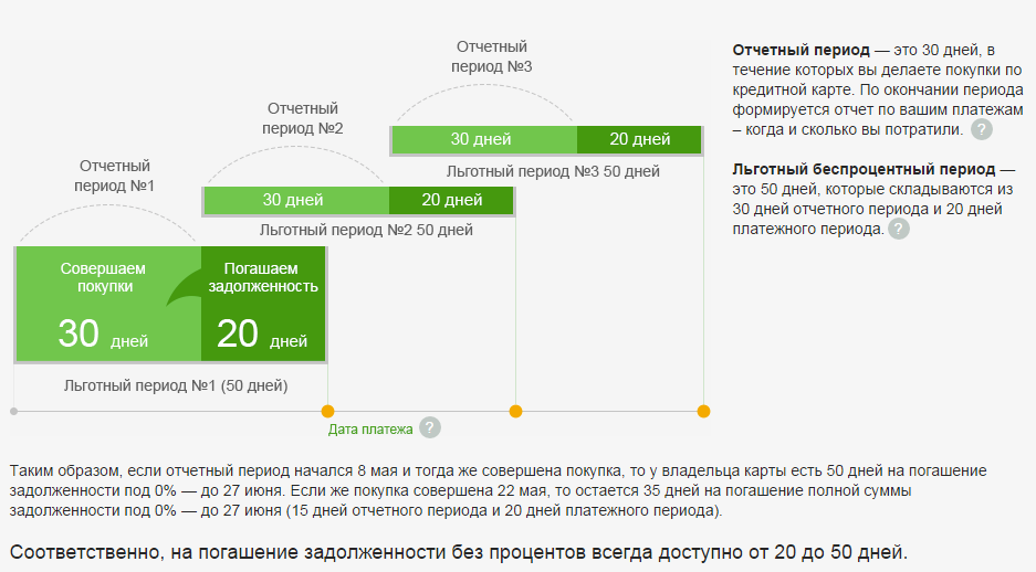 здесь период без начисления процента составляет до 50 дней . Из них первые 30 – это отчетный период, т.е. фактический календарный месяц и плюс 20 дней на погашение задолженности.