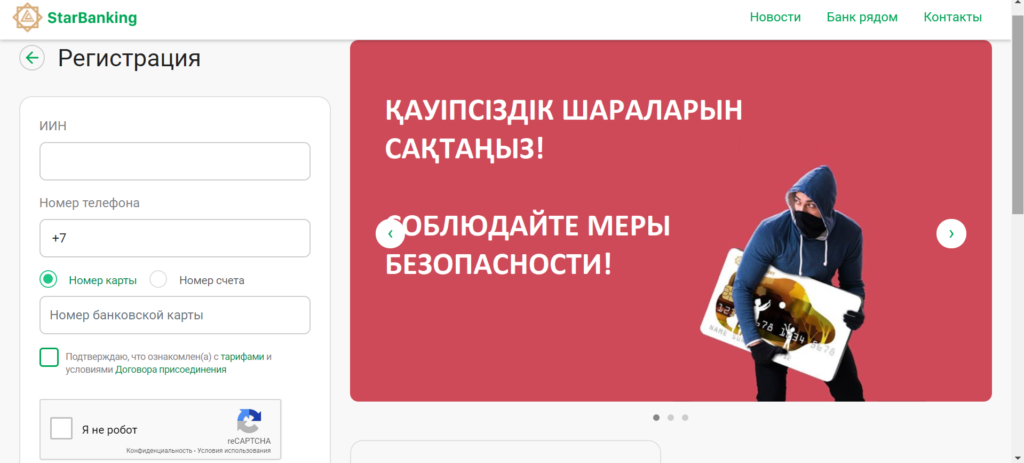 Чтобы зарегистрироваться в Старбанкинге пользователю нужно быть клиентом банка Центркредит. Так как при регистрации понадобится номер карты либо счета Центркредита.